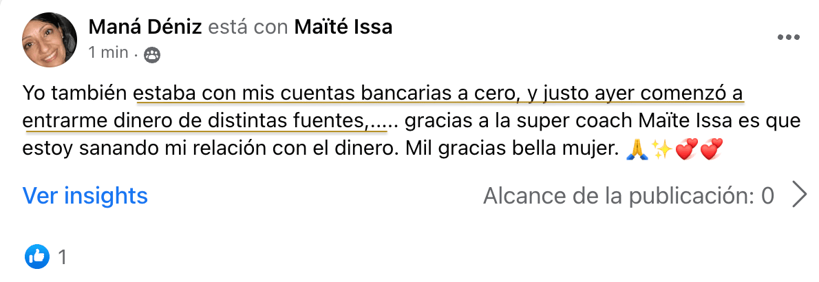 Maïté Issa es Coach Experta en Manifestación, Autora del libro Best Seller, Tu Éxito es Inevitable, y creadora del Pódcast #1 sobre Manifestación en habla hispana, con más de 13M de escuchas.